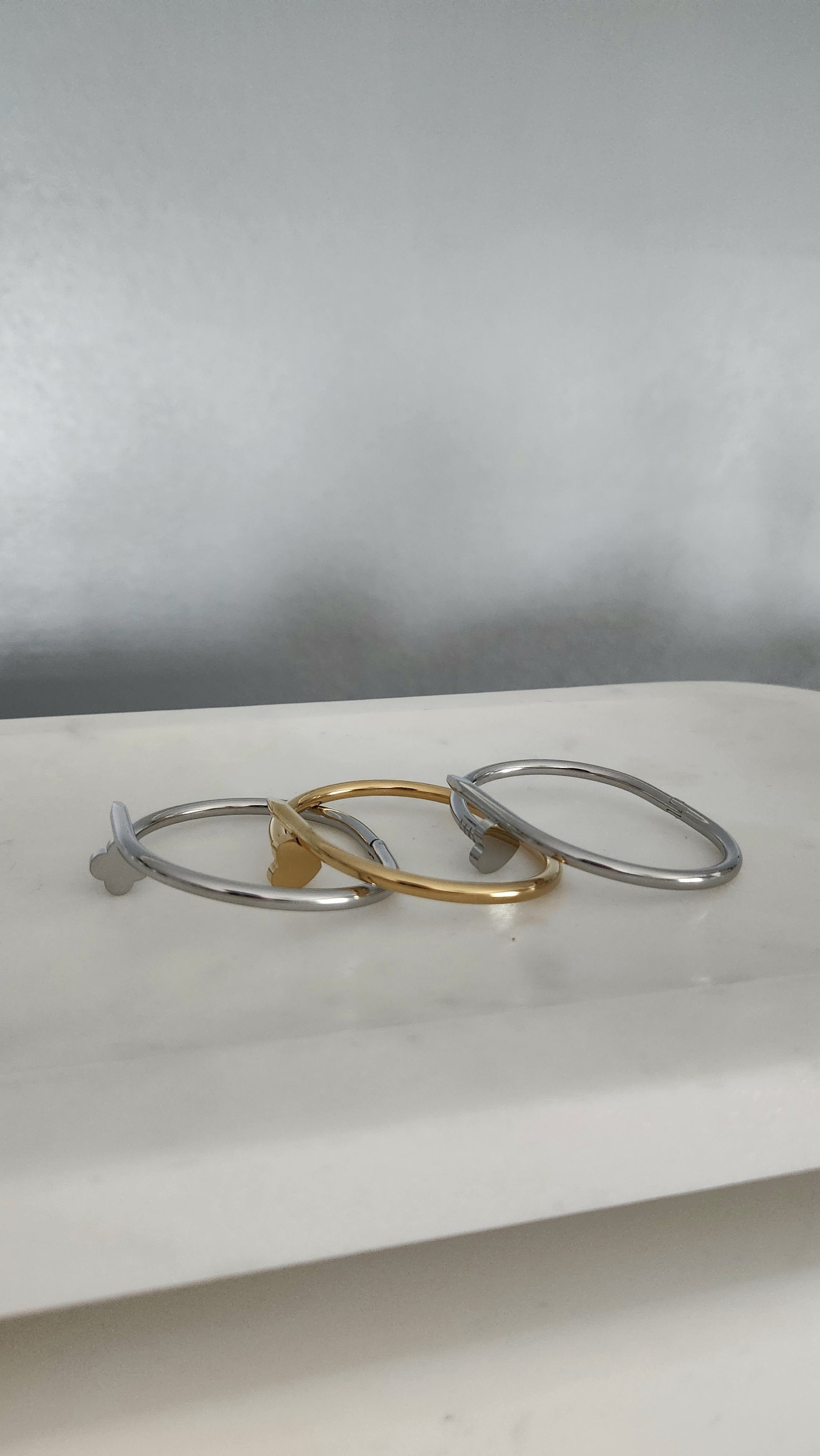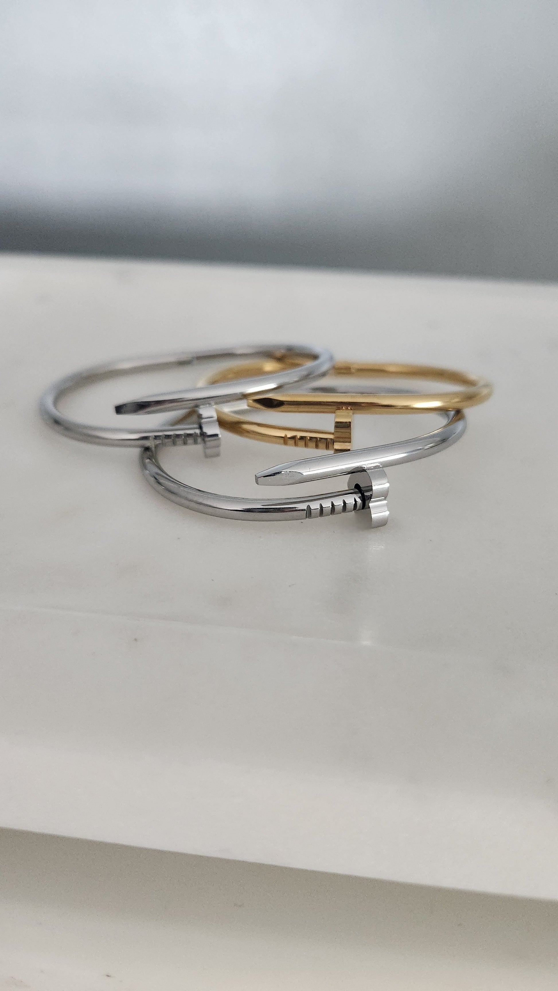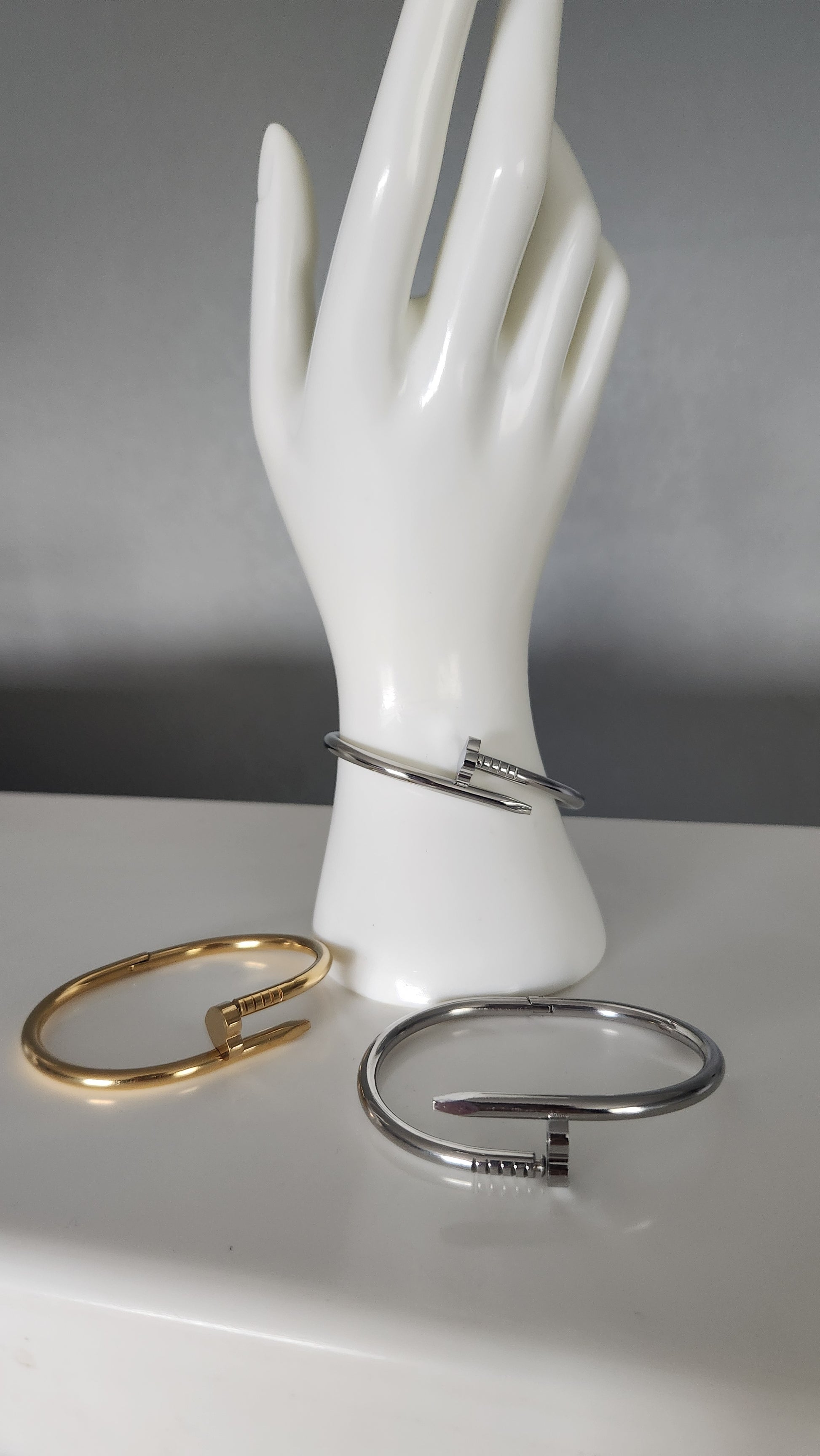 Meet the Clavo Bangle, where nail art meets wrist bling! This playful piece features a quirky nail design and a handy snap closure. Available in stainless steel or gold-plated, it’s the perfect choice for those who love a little heart or clover detail. Wear it and let your style do the talking!