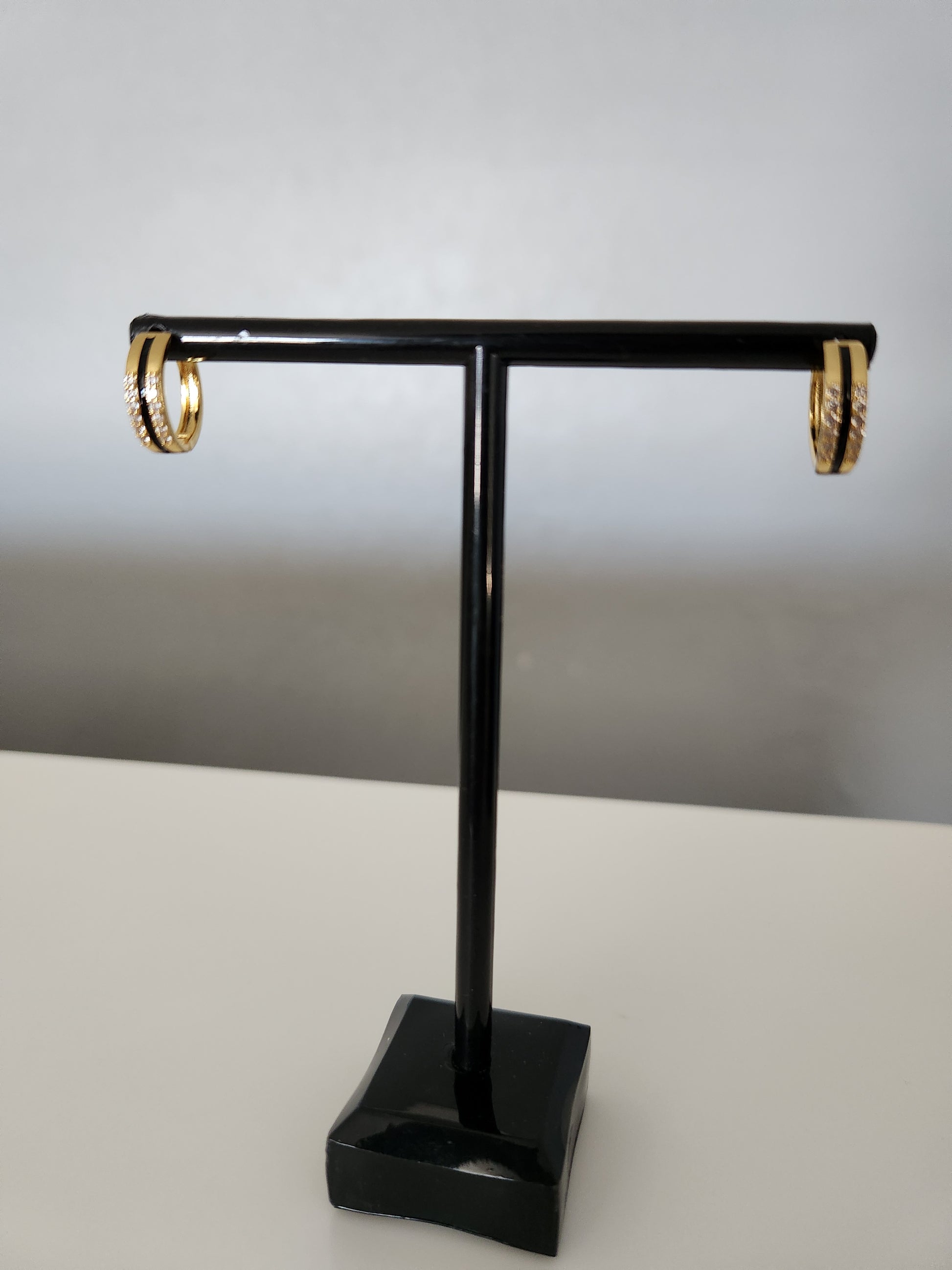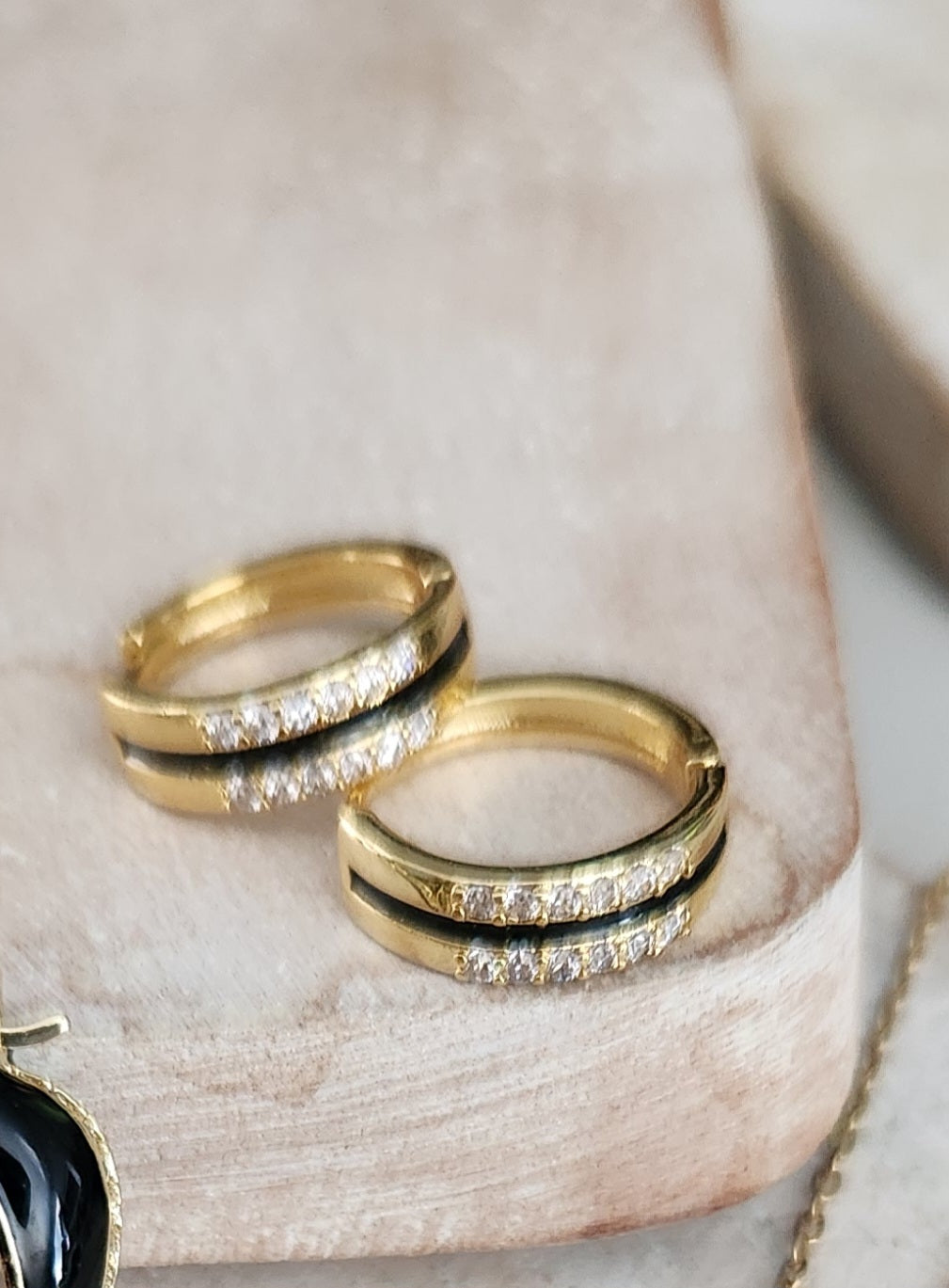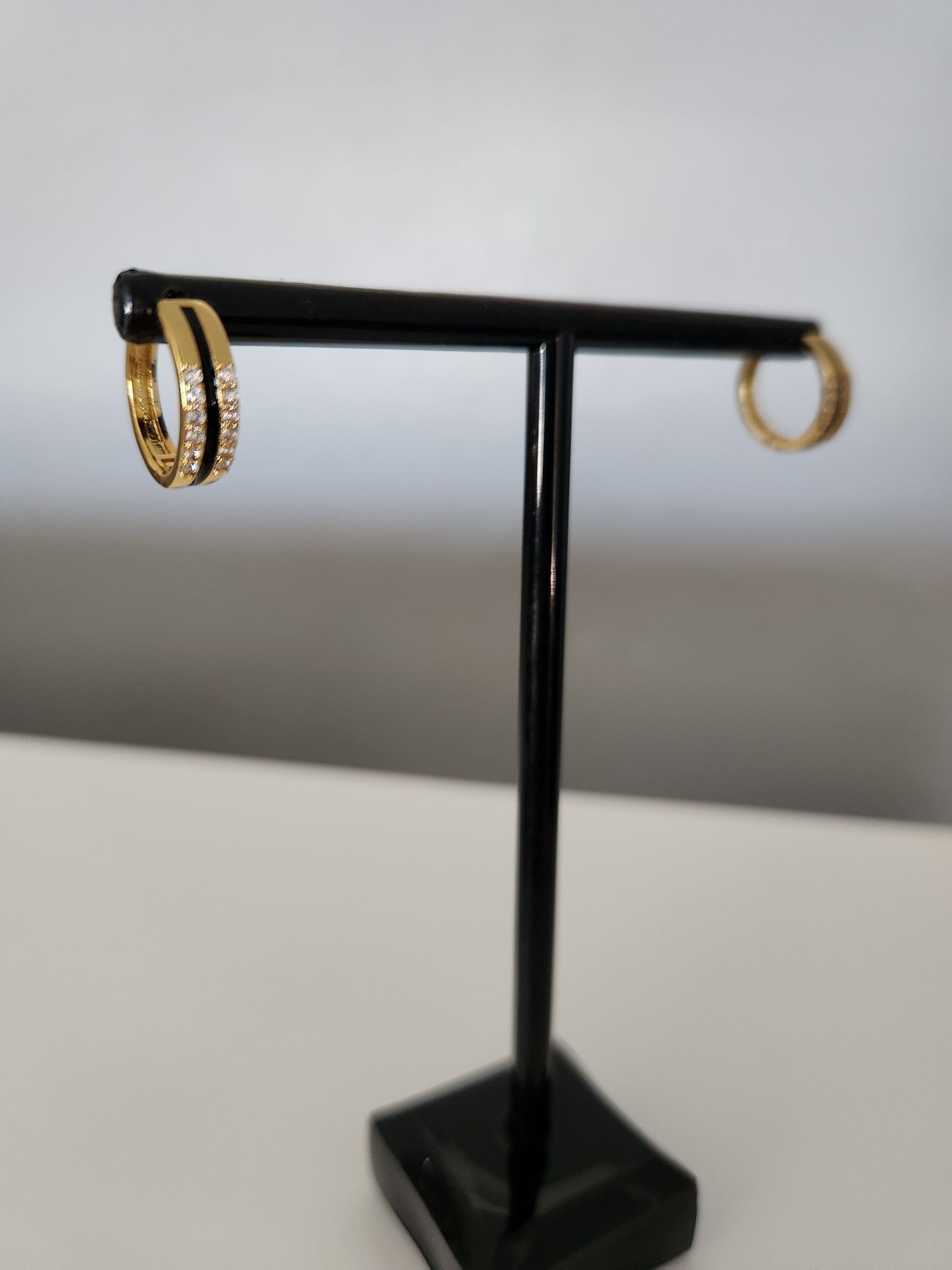 Unleash your bold and daring nature with Leah Huggies. These gold plated huggies feature a sleek black inlay and sparkling clear rhinestone accents. Guaranteed to resist tarnishing and water damage, they are the perfect accessory for all your risk-taking adventures.