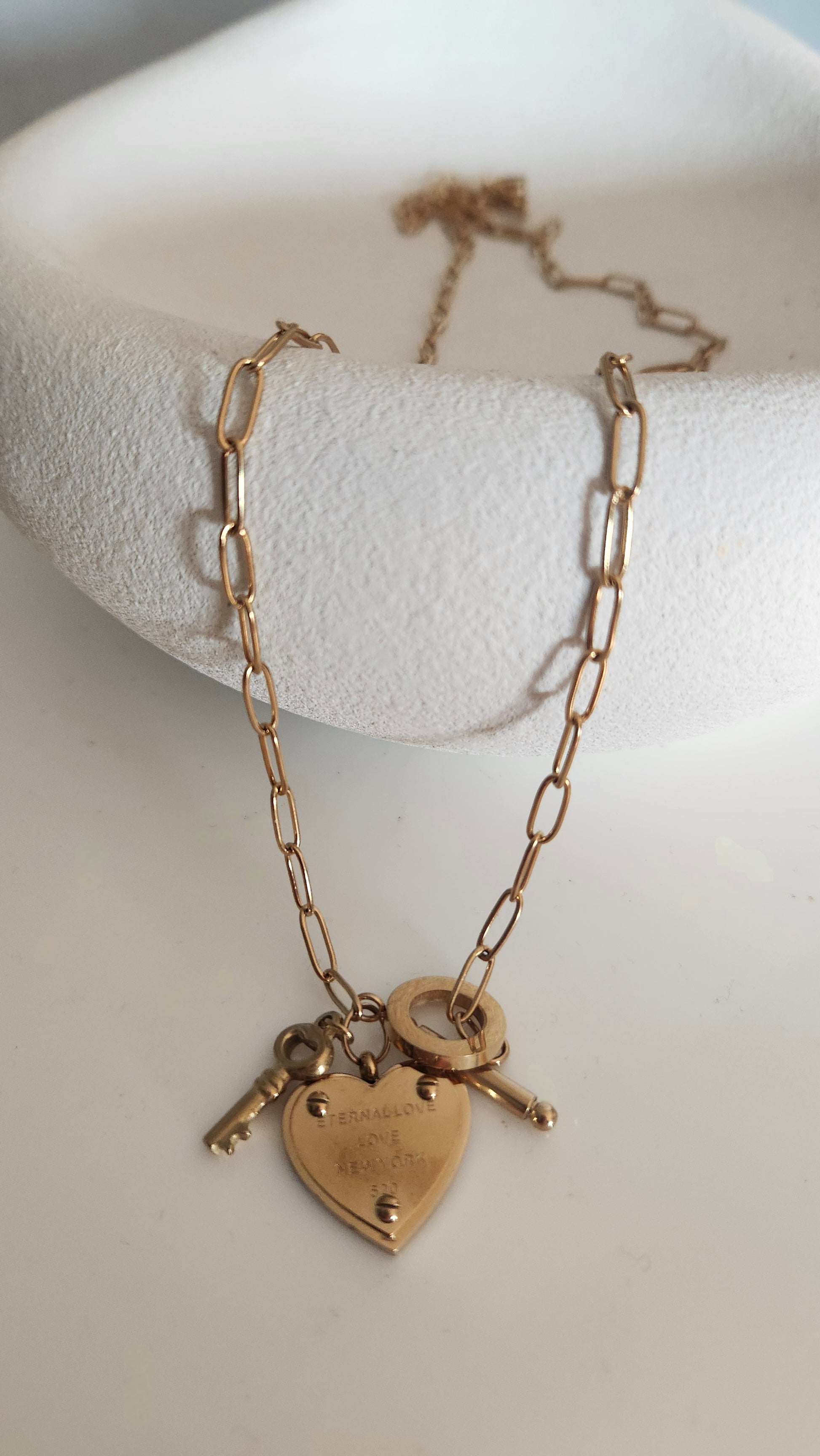 Crafted with precision using gold plated titanium steel, the Kora Long Necklace is the ultimate way to add flair to any ensemble. With a lengthy 27 inch chain, it offers endless styling options, while its playful heart and key charm adds a touch of whimsy. And don't worry, it's secured with a toggle clasp for worry-free wear. A must-have for any trendy individual.