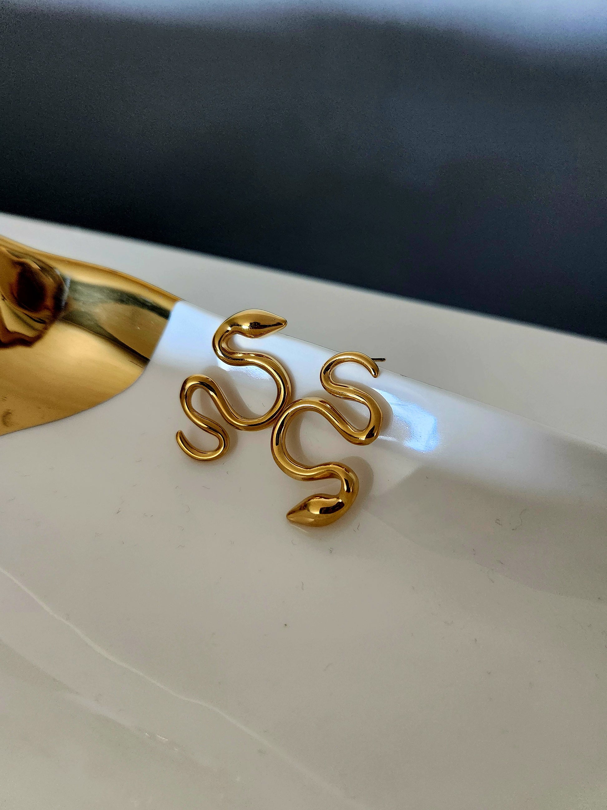 Slay the fashion game with Nagini Earrings! The gold plated stainless steel adds a touch of luxury to the sleek snake design. Be bold and embrace your inner risk-taker with these daring earrings. Add a touch of adventure to your everyday look and make a statement!