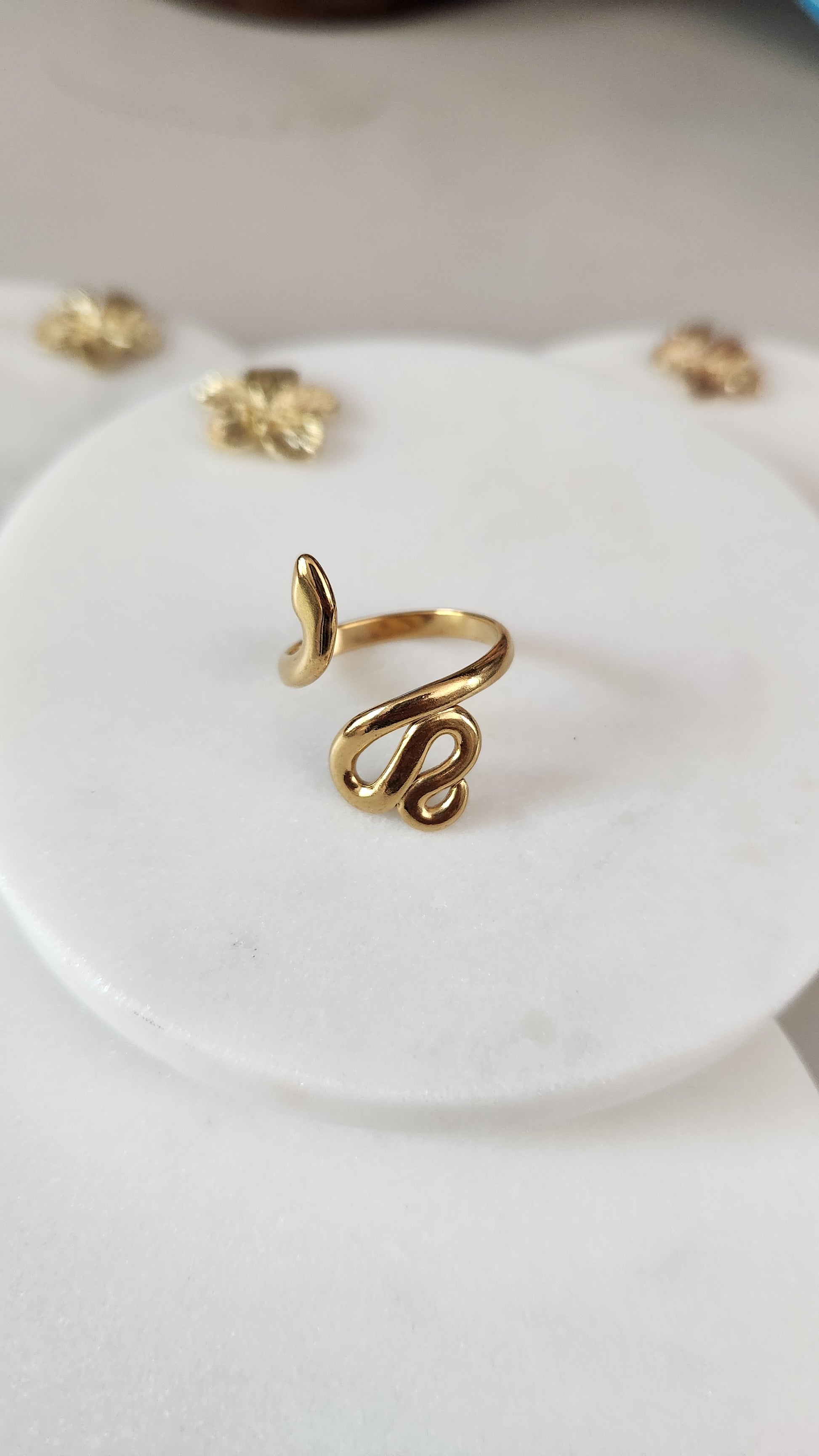 Unleash your fierce style with the Nagini Ring. Made of gold plated stainless steel, this adjustable snake ring adds a touch of edgy elegance to any outfit. Crafted for durability, it exudes strength and versatility, making it the perfect accessory for any occasion.