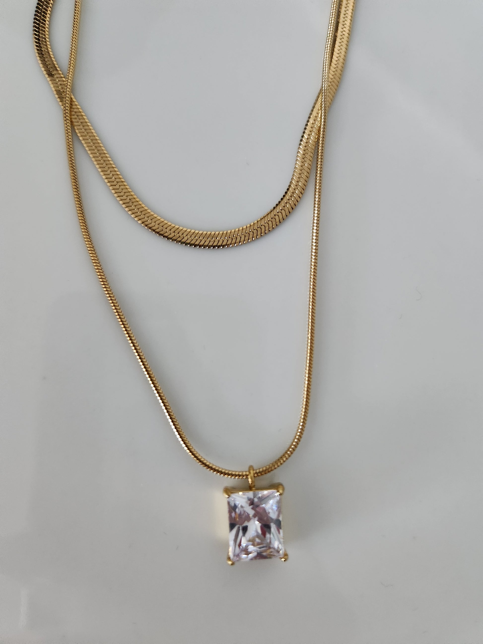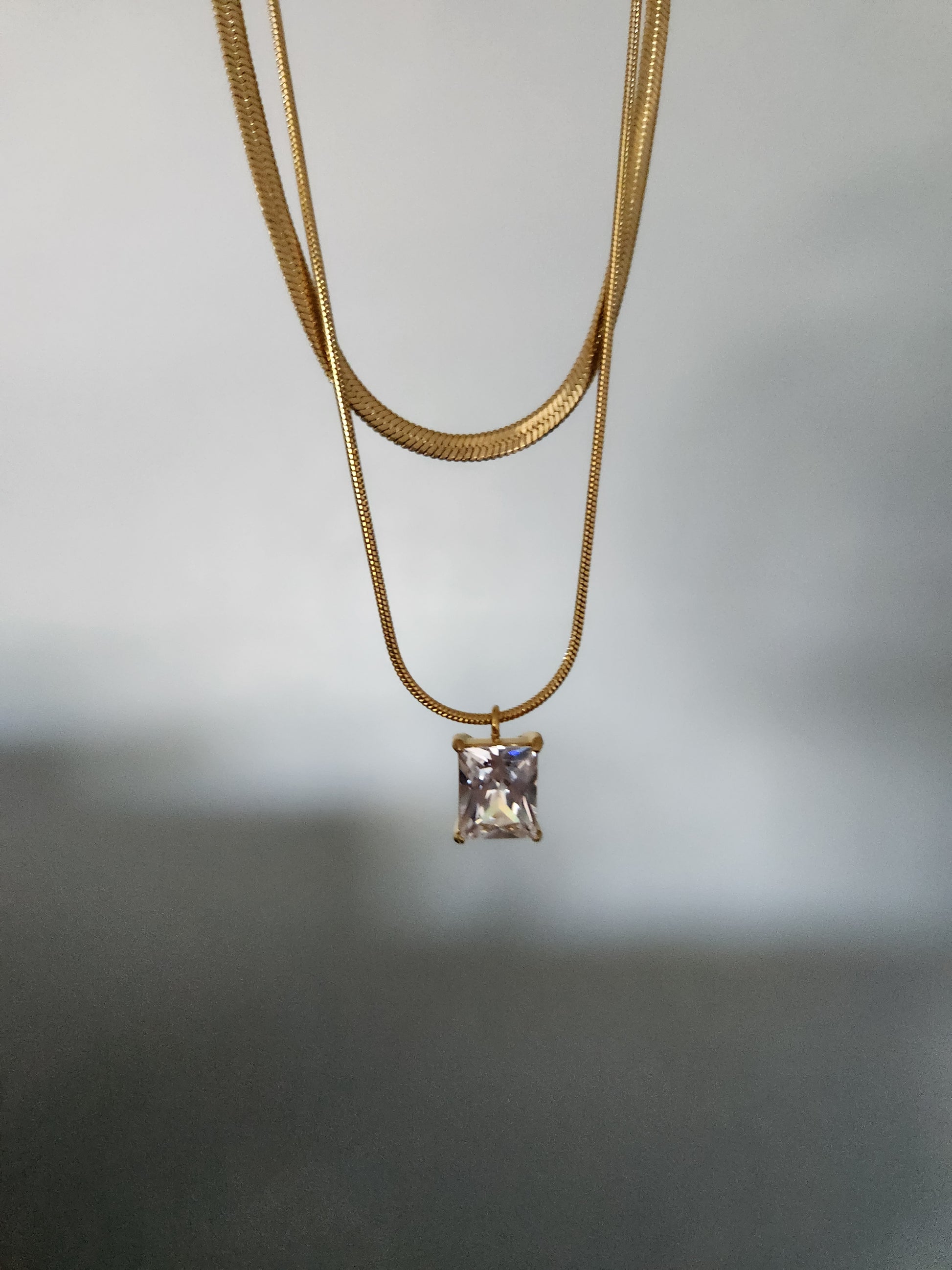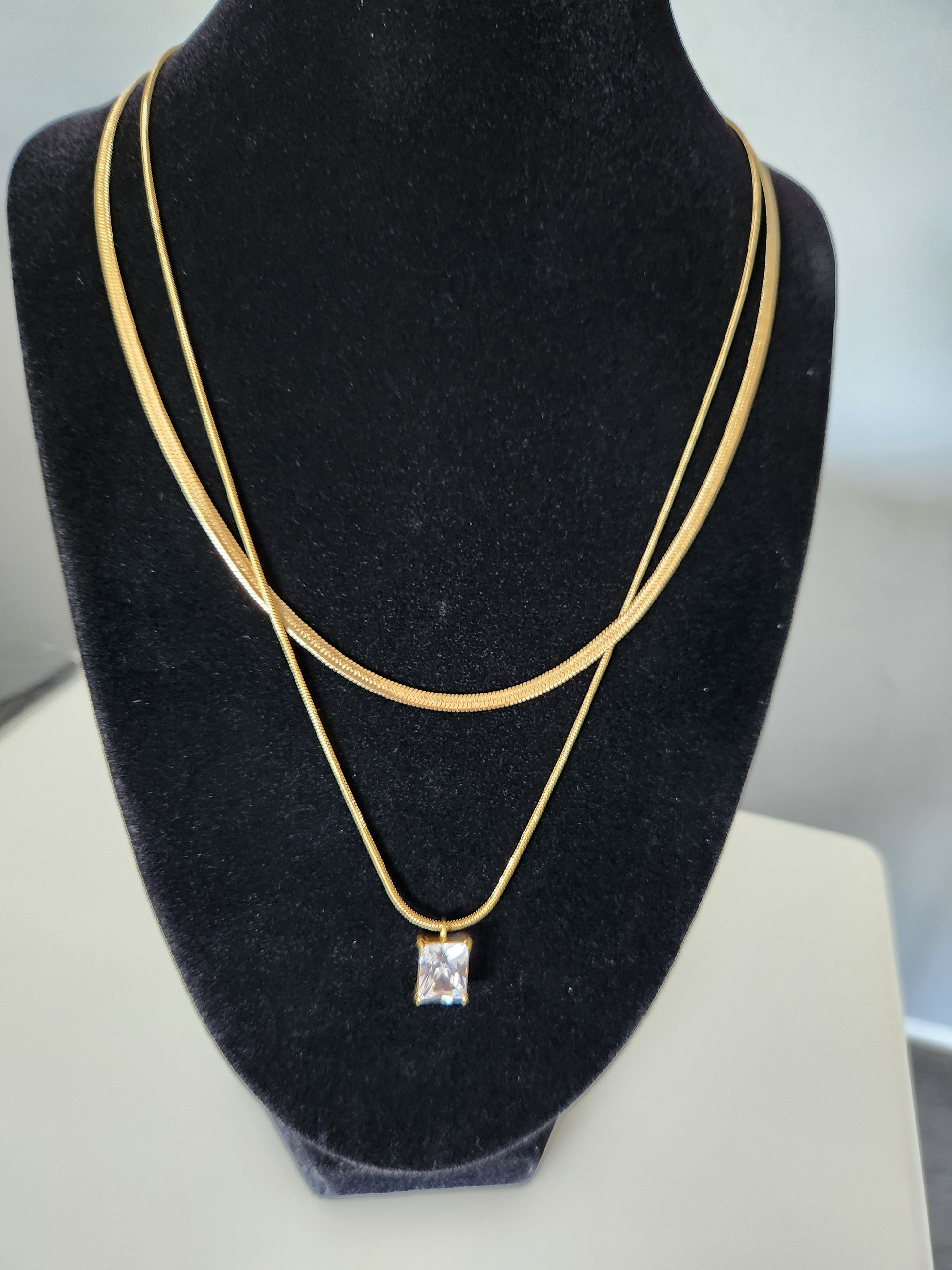 Indulge in luxury with our Noelle Necklace. This intricate piece boasts a double layer of gold plating and a sparkling zircon clear pendant. Elevate your wardrobe with elegant sophistication.