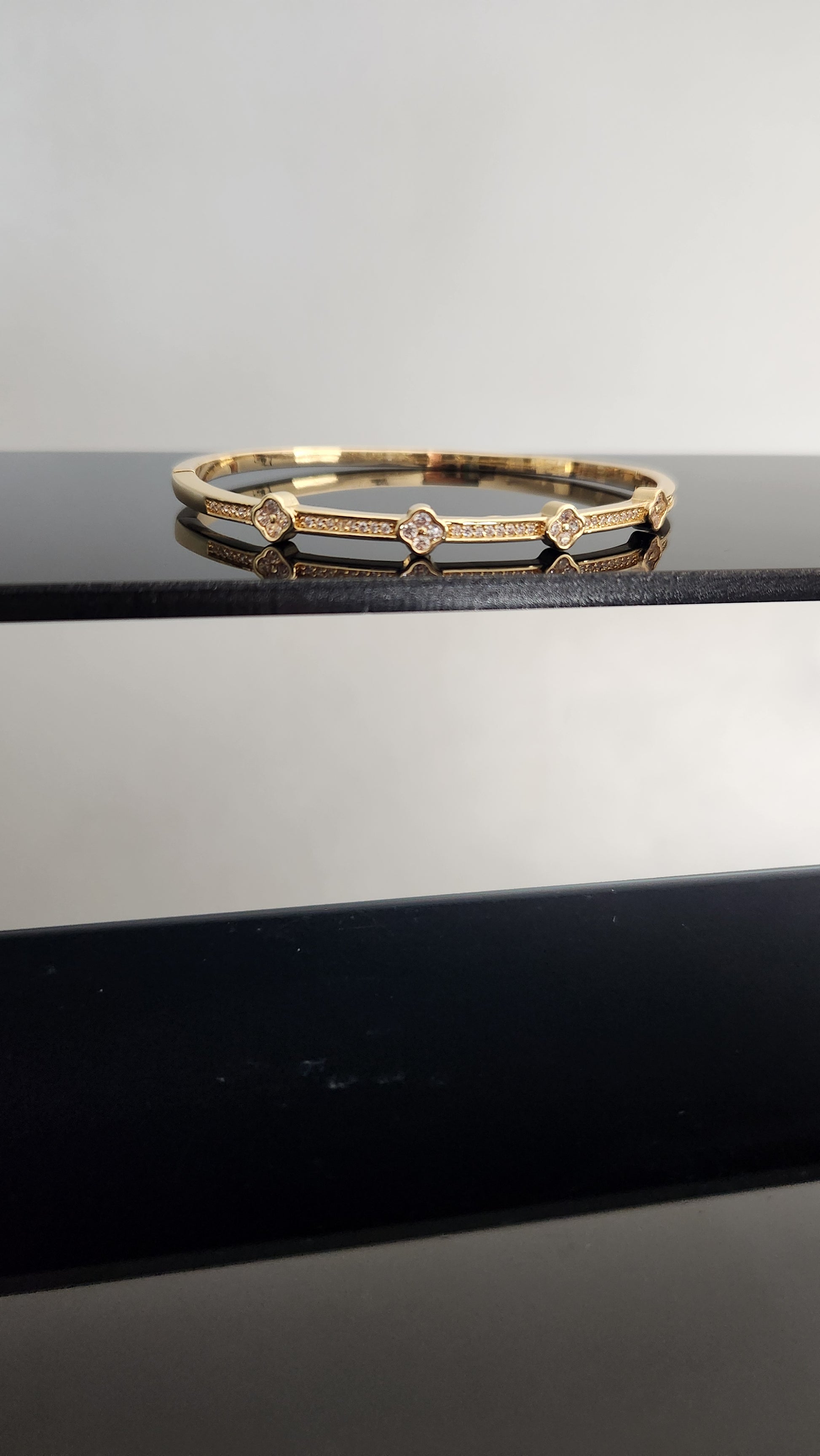 Upgrade your jewelry collection with the Nora Bangle! Crafted with 18k gold plating, this bangle features a convenient clap opening and stunning zircon embed accents. The intricate clover design adds a touch of elegance to any outfit. Elevate your style with the Nora Bangle.