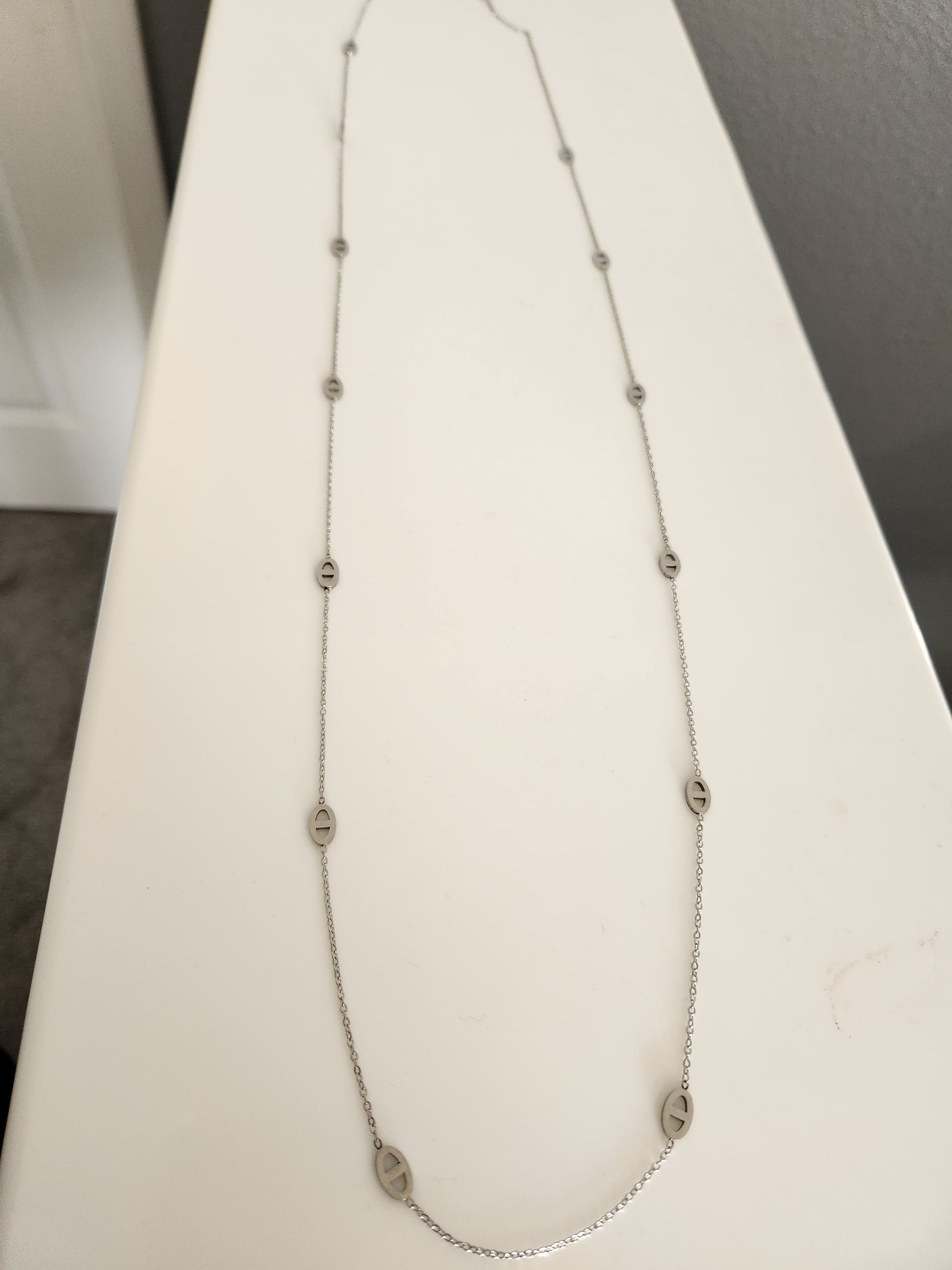 Stainless steel long necklace. Can be doubled up or worn long. 21 inches in total length