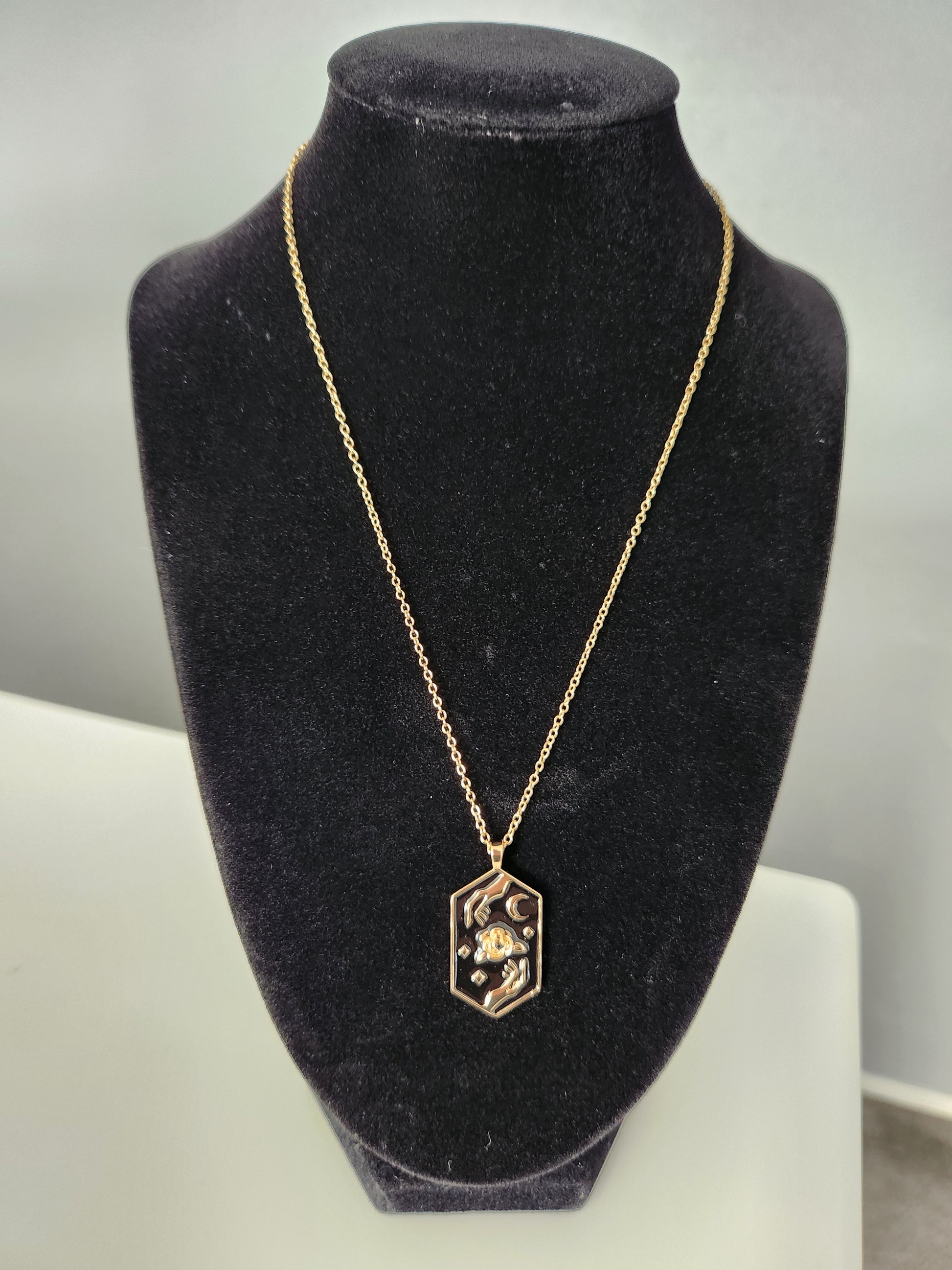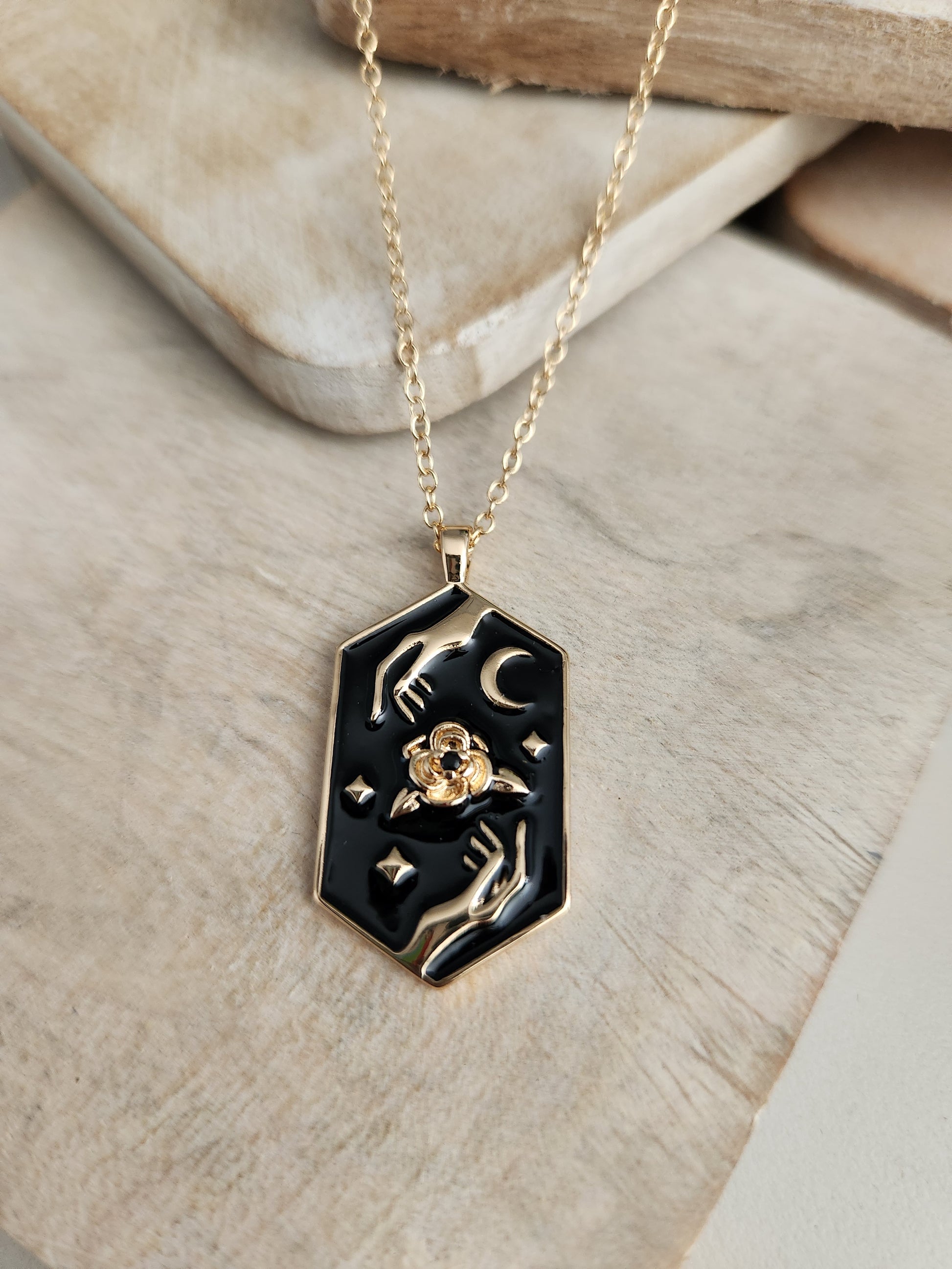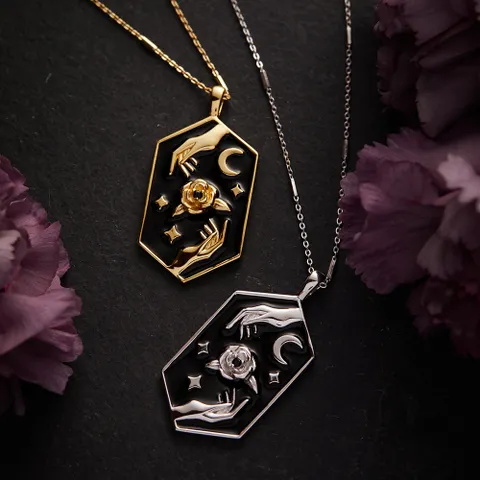 Embrace the boldness of the night with our Rosa Necklace. Featuring rose hands and moon detail on a gold chain, this necklace adds a daring touch to any outfit. Wear it to stand out and make a statement!
