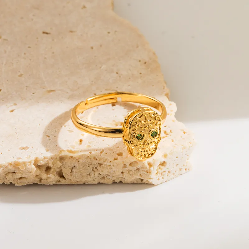 Indulge your daring side with our gold plated Sugar Skull Bracelet or Ring. Make a statement with this bold piece featuring a vibrant sugar skull design. Its adjustable fit allows for effortless wear and adds a touch of adventure to any outfit.