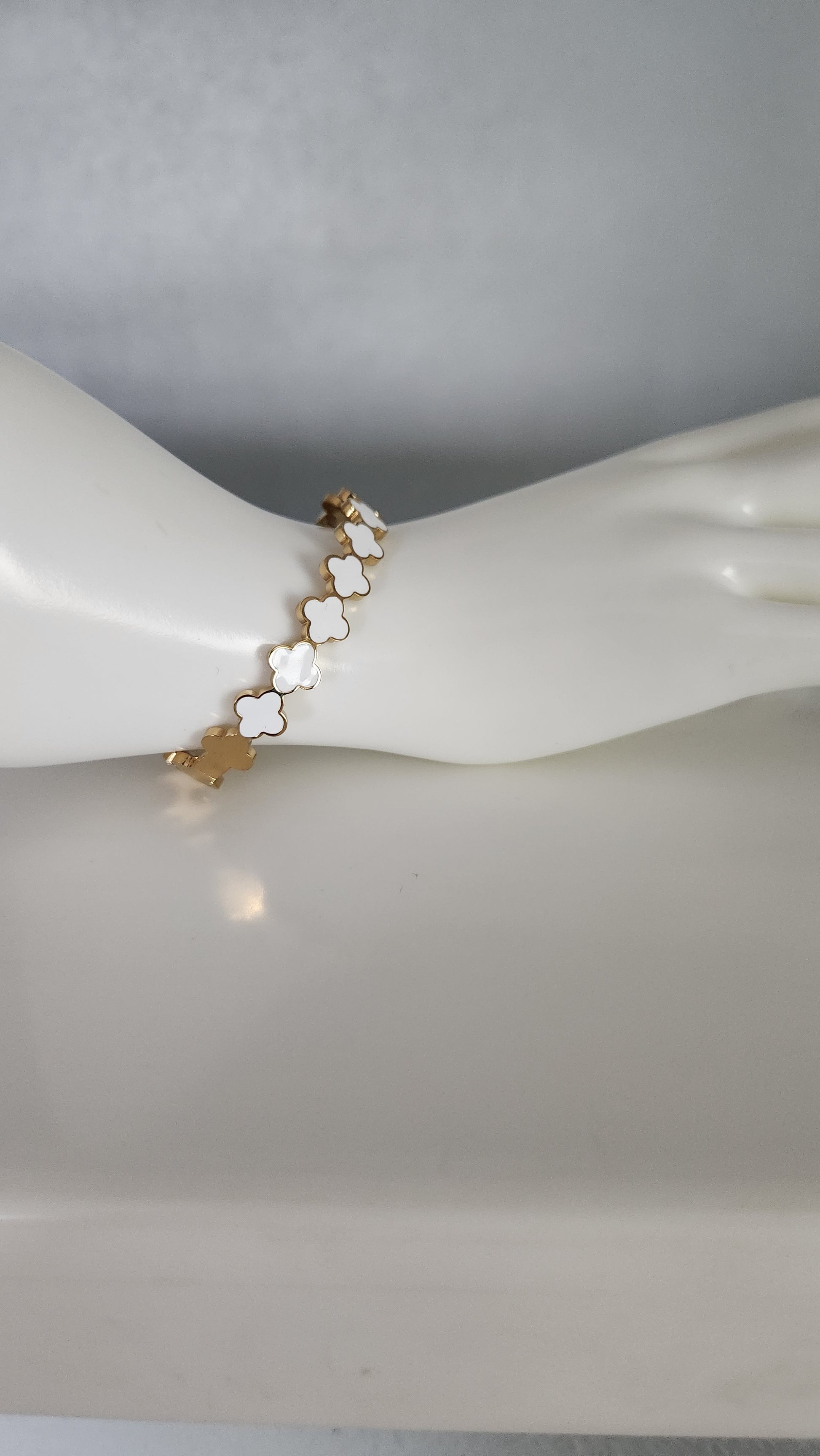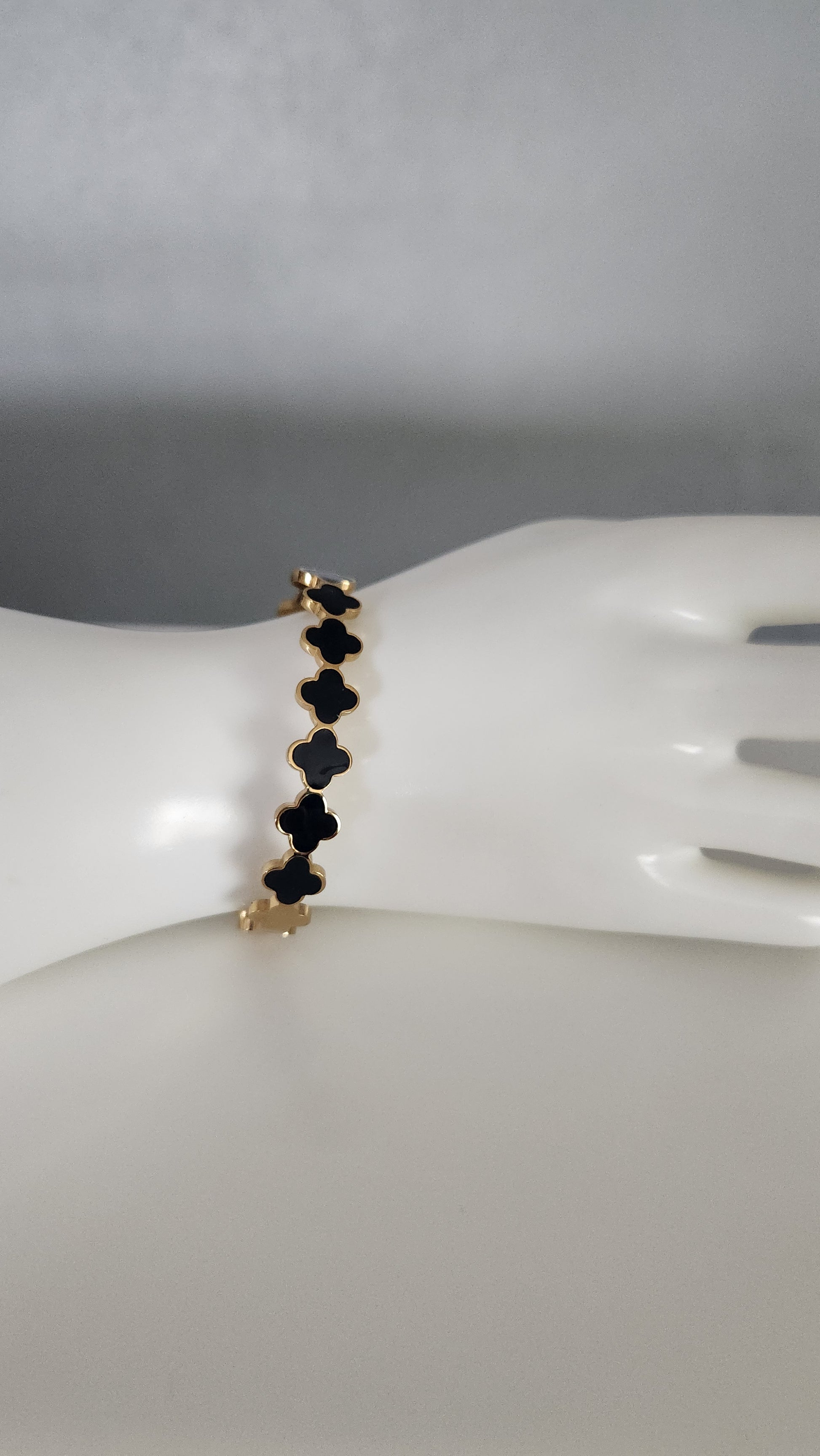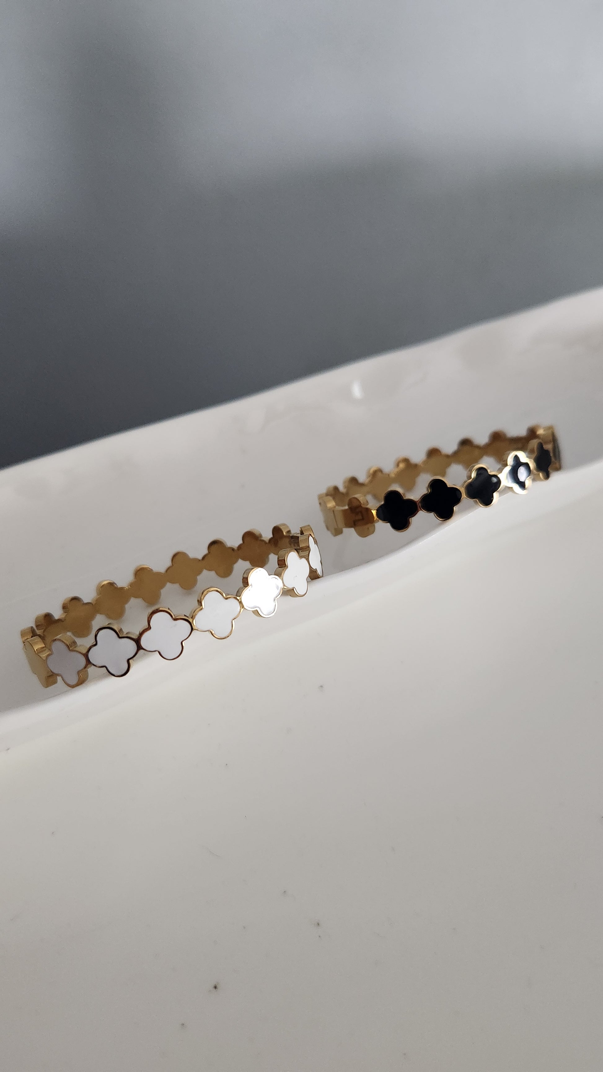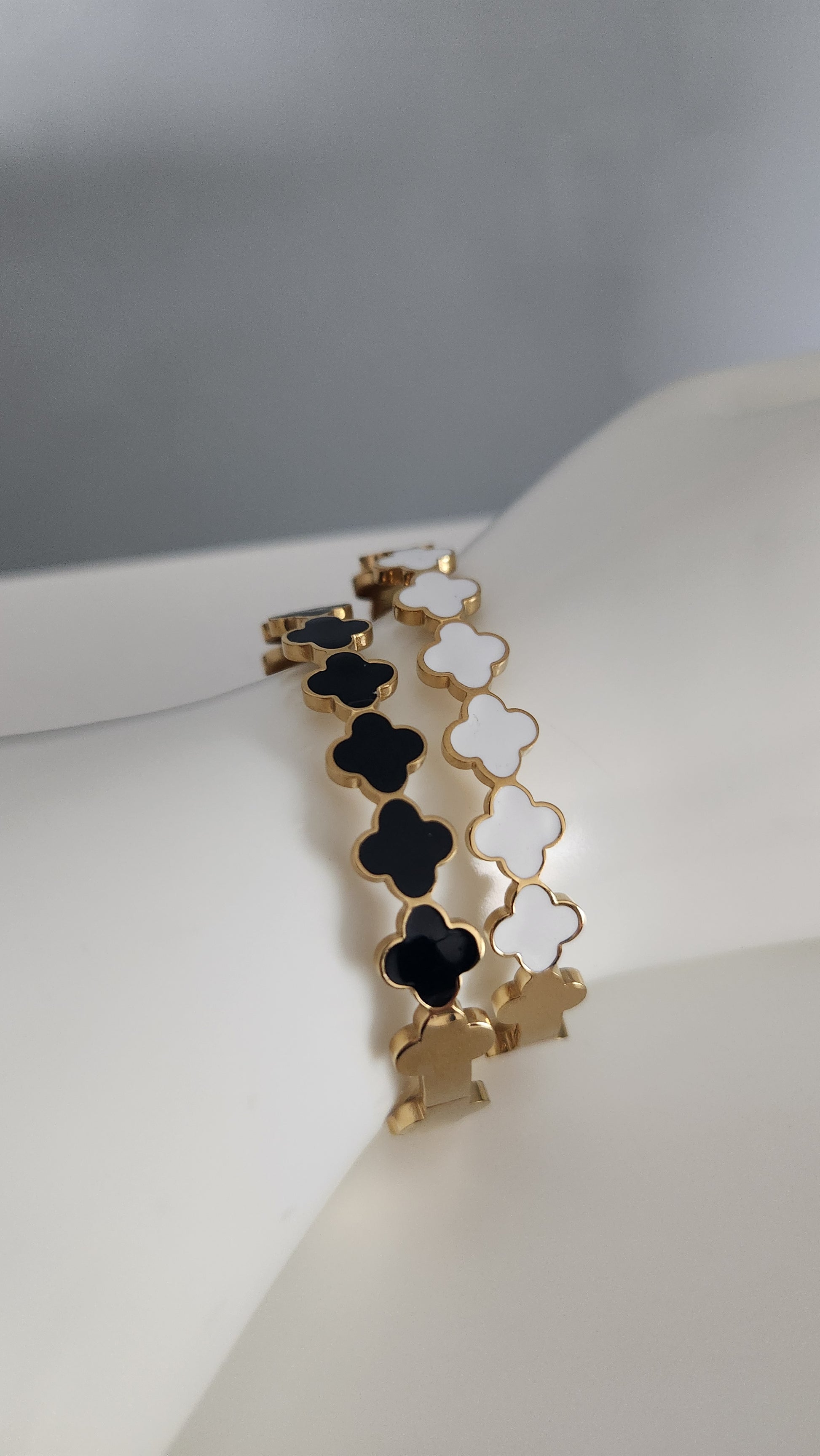 The Leila Bangle is a sophisticated addition to any jewelry collection. Made from high-quality stainless steel, this bangle features a stylish clover design and a convenient snap closure. With options in both gold and black or gold and white, it's the perfect accessory to elevate any outfit.
